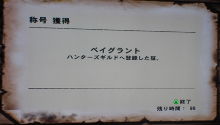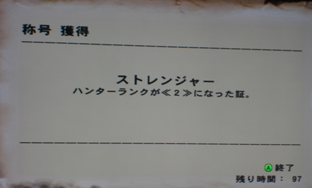 HR2になり、称号:ストレンジャー ゲット。ハンターライフHR2になった証。