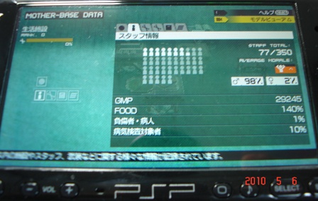 この画面はマザーベースのDATA画面で、今の拙者のマザーベースの人員数とかFOOD 140%とかその他詳細DATAを観ることが可能。