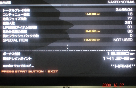 拙者はコンティニュー数16回、危険フェイズ回数77回、殺傷人数351人という記録で、称号はHAWK。